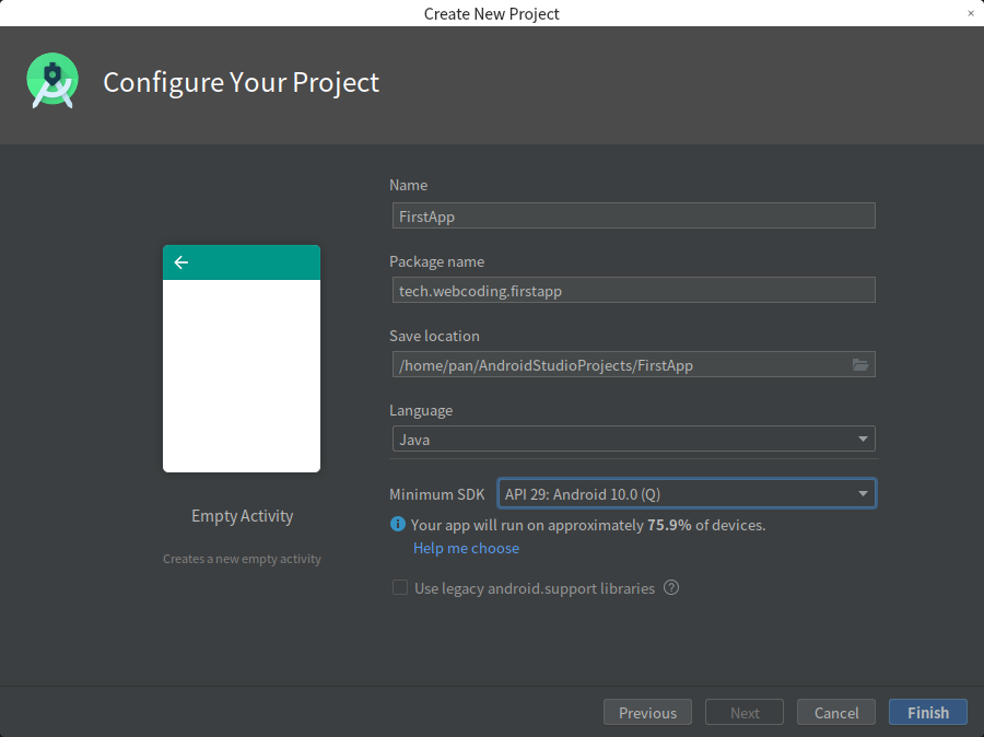 我们使用Android Studio 3.6.3版本新建一个空的APP项目,因为该版本是Android 10 r41发布之后的版本,适合用于基于Android 10的APP开发,Android Studio 历史版本下载地址为:https://developer.android.google.cn/studio/archive