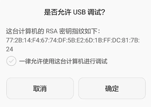 在以上操作过程中,如果电脑是第一次使用 adb 连接手机,电脑上会弹出一个提示框,选择 允许,即可完成设置,如下图: