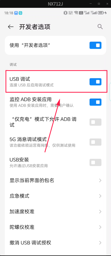 再进入开发者选项,打开 USB debugging 选项,如下图