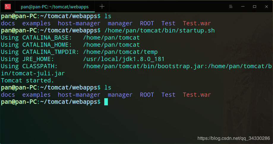 你的域名需要解析到你的服务器ip地址上,这里我绑定的域名是jkdev.cn,我们默认使用8080端口,如果你的项目在公网上应该改为80端口。可以看到启动tomcat之后,Test.war被解压了,如图所示: