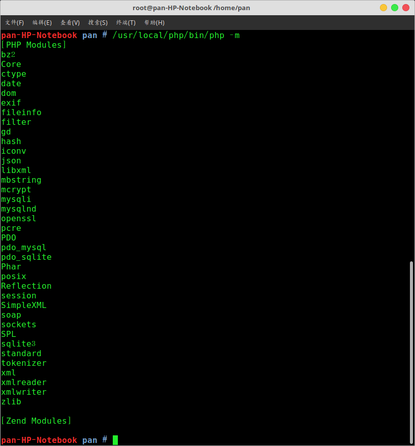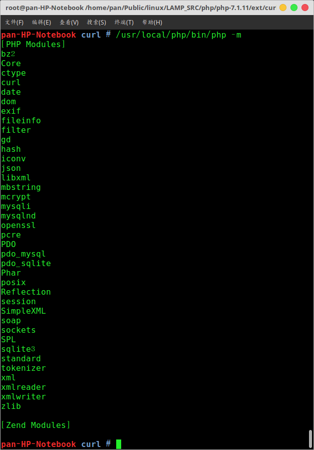 重启Apache服务器或者php-fpm即可生效,如果再次调用php -m命令,可以看到已经多出了curl扩展了: