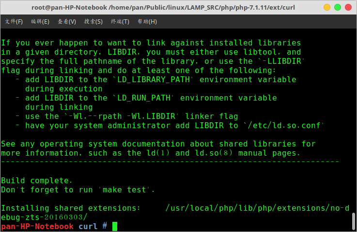 如图所示就是安装成功了,即生成了curl.so文件,位置就在/usr/local/php/lib/php/extensions/no-debug-zts-20160303/目录下,如下图: