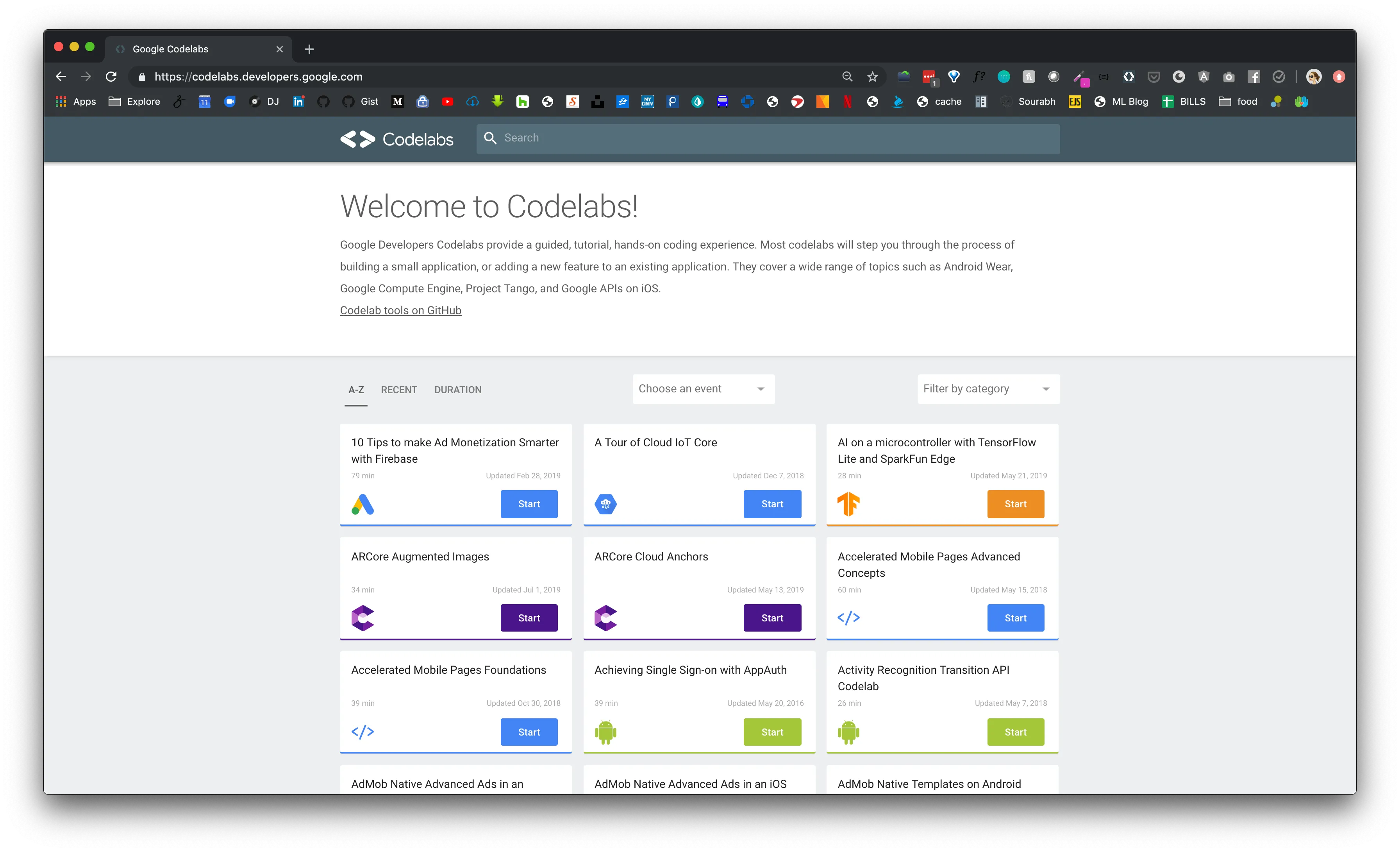 Google Developers Codelab 提供了一种引导式编码实践教程体验。大部分 Codelab 会逐步介绍开发小应用或在现有应用中新增功能的过程。其友好的交互体验,以及丰富的资源,使得 Codelab 成为学习新技能的好方法。Google Codelabs 网站可以通过 https://codelabs.developers.google.cn/?hl=zh-cn 网址访问。